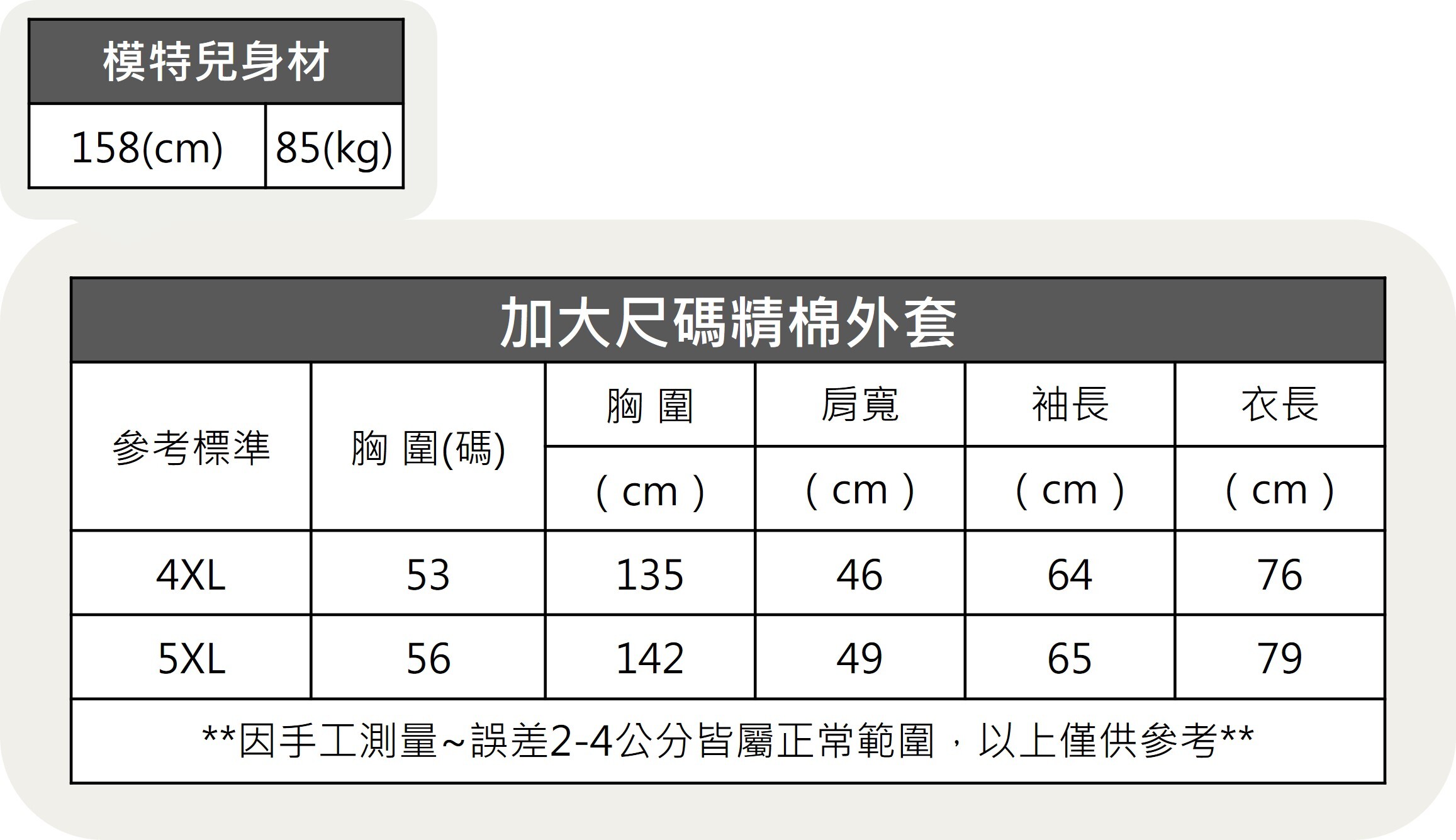 版型尺寸: 專屬大尺碼設計,提供 胸圍 53 吋 與 56 吋 兩種規格,各種身形皆可安心穿著。